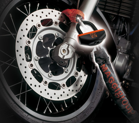 Absolutely sturdy and reliable anti-theft system, characterised by a special design with long internal link and presence of a wide final link. It allows performing a double loop when anchoring your vehicle to fixed supports, to fully exploit the length of the chain, relieving the motorcyclist from performing difficult movements to position the motorcycle near the pole. It also allows to firmly secure two motorcycles together, occupying a minimal space. It offers utmost safety and anti-tampering properties for motorcycles of medium and big displacement or for motorcycles with a high sales value, parked in places at risk or for long periods of time.