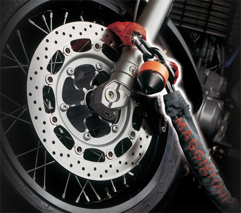 Absolutely sturdy and reliable anti-theft system, characterised by a special design with long internal link and presence of a wide final link. It allows performing a double loop when anchoring your vehicle to fixed supports, to fully exploit the length of the chain, relieving the motorcyclist from performing difficult movements to position the motorcycle near the pole.